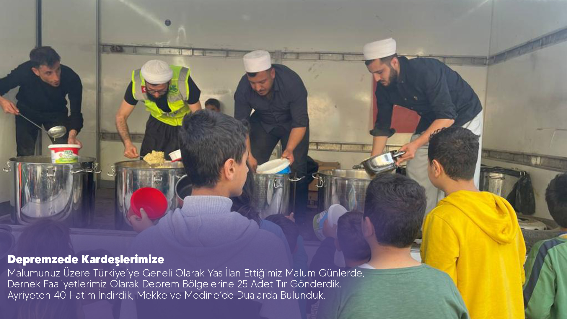 Malumunuz Üzere Türkiye’ye Geneli Olarak Yas İlan Ettiğimiz Malum Günlerde, Dernek Faaliyetlerimiz Olarak Deprem Bölgelerine 25 Adet Tır Gönderdik. Ayriyeten 40 Hatim İndirdik, Mekke ve Medine’de Dualarda Bulunduk.